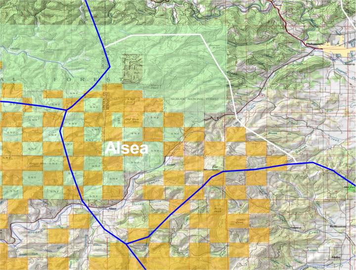 midway between Waldport and Corvallis on Highway 34. Alsea's web site, posted