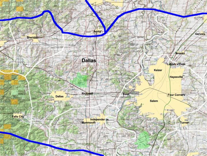 Falls City and Dallas, south to the Four Corners area toward Monmouth, and east