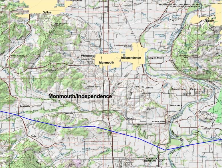 between Monmouth and Dallas, taking in Lewisville, on the south to incorporate